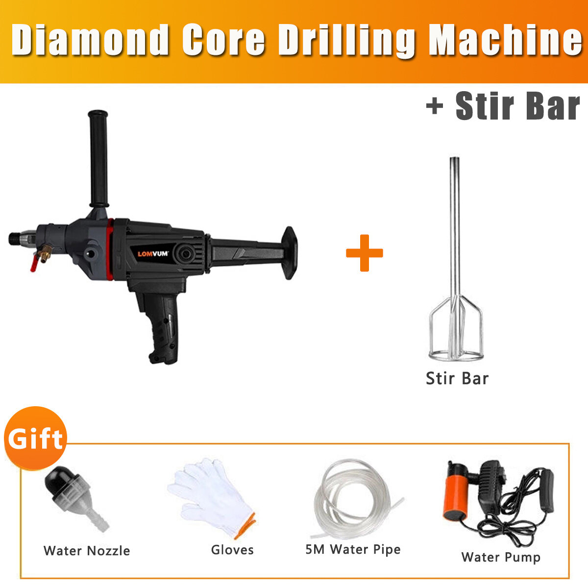Package D includes the Diamond Core Drilling Machine, a stir bar, a water nozzle, a pair of gloves, a 5M water pipe, and a water pump.