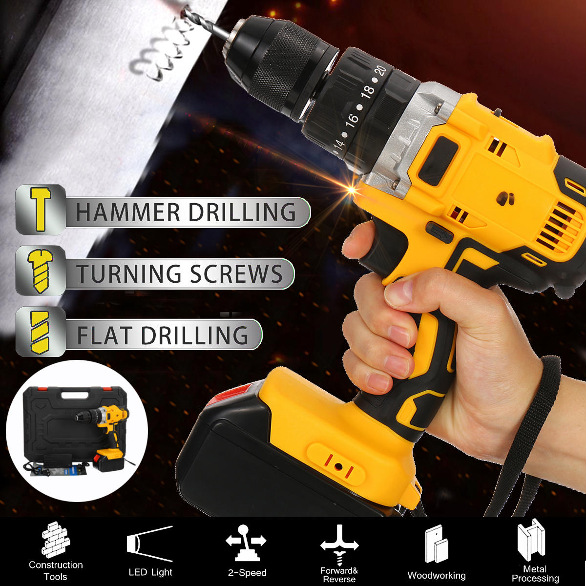 Introducing the Cordless Drill with Double Speed Adjustment, LED Lighting, and a Large Capacity Battery boasting 150Nm Torque.