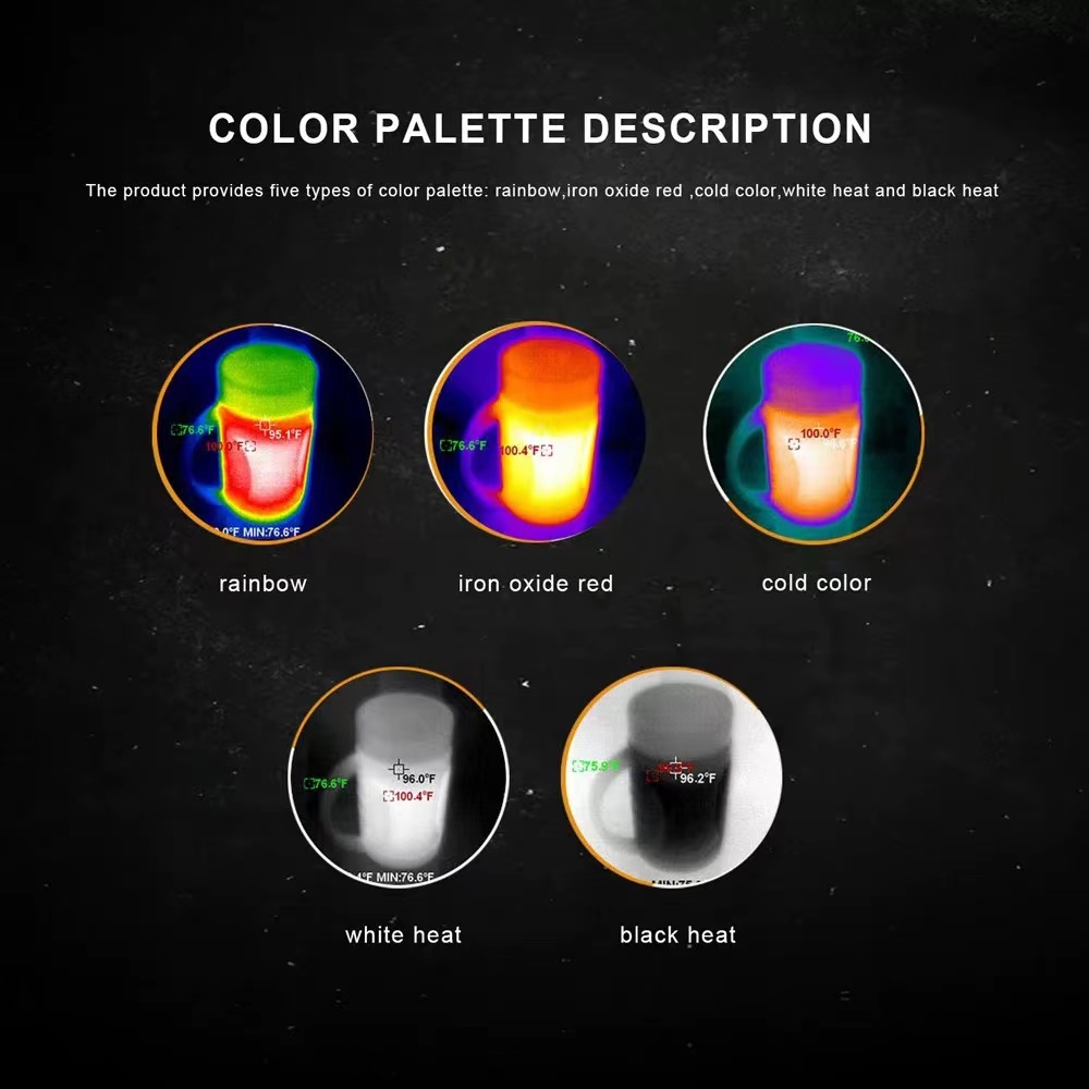 The device encapsulates a spectrum of colors within its palette, including Iron red, white, and a variety of other color combinations. It operates within a wavelength range from 8~14μm and provides a 33° horizontal Field of View (FOV). The instantaneous field of view (IFOV) is measured at a significant 18 mrad.